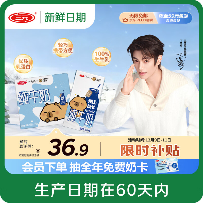 包邮 三元【新鲜日期】小方白纯牛奶200ml*24盒 100%生牛乳